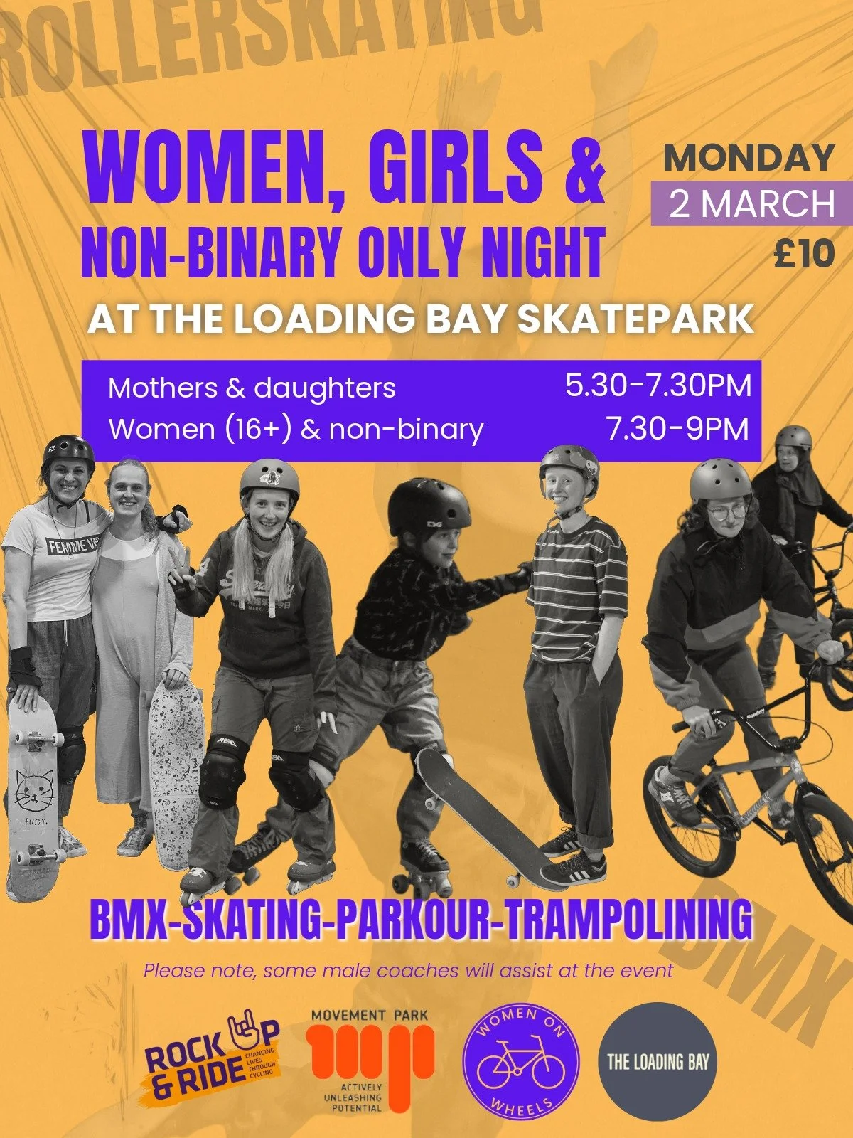 On the night The Loading Bay will be closed off to men and boys and only welcome women, girls and non-binary people. Only girls aged 6+ are allowed to cycle/skate/jump. We’ve split the evening up to give everyone plenty of space: Mums and daughters - 5.30-7.30pm and women (16+) and non-binary - 7.30-9pm.