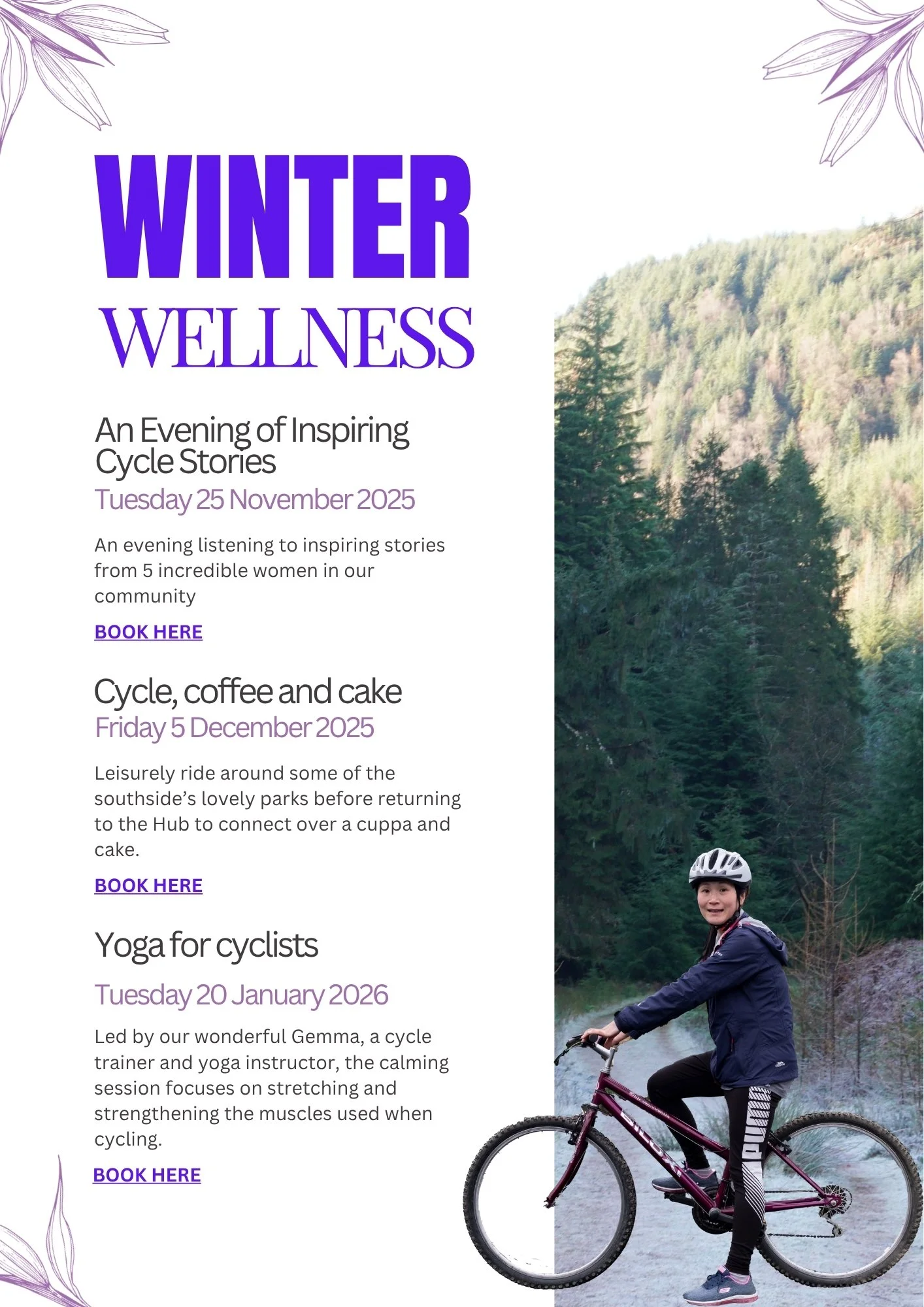 A leisurely cycle around the Southside Parks before we return to the Women on Wheels Hub to chat and connect over hot drinks and cake. A real mood booster to kick-start the weekend.
